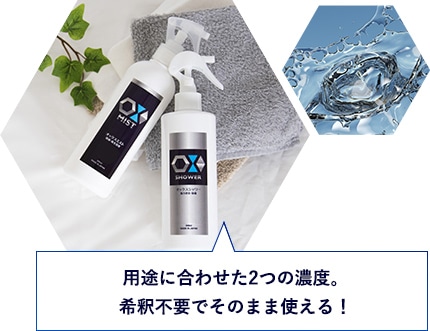 OXシリーズは、様々なウイルスや菌にはたらく次亜塩素酸水です。消臭力にも優れており、悪臭の原因菌を分解。花粉タンパク質やカビにも反応します。